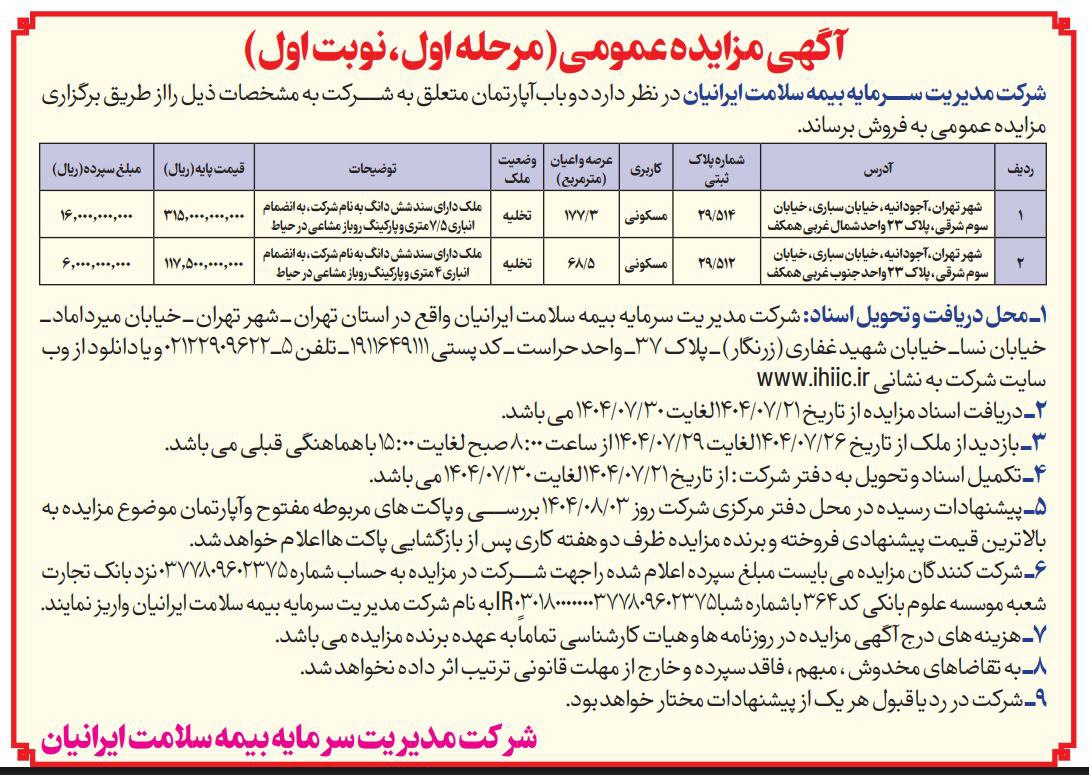 به گزارش روابط عمومی شرکت مدیریت سرمایه بیمه سلامت ایرانیان، بر اساس آگهی منتشر شده در روزنامه اطلاعات مورخ یکشنبه ۲۰ مهر ماه ۱۴۰۴، شرکت مدیریت سرمایه بیمه سلامت ایرانیان در نظر دارد دو باب آپارتمان متعلق به شرکت به مشخصات ذیل را از طریق برگزاری مزایده عمومی به فروش برساند.