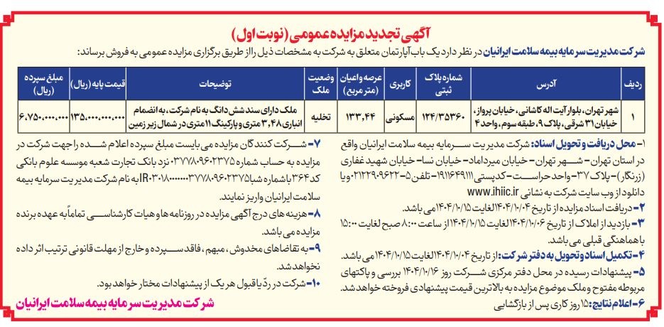 به گزارش روابط عمومی شرکت مدیریت سرمایه بیمه سلامت ایرانیان، بر اساس آگهی مزایده عمومی منتشر شده در روزنامه اطلاعات مورخ پنجشنبه ۴ دی ماه ۱۴۰۴، شرکت مدیریت سرمایه بیمه سلامت ایرانیان در نظر دارد نسبت به فروش یک باب آپارتمان متعلق به شرکت اقدام کند.