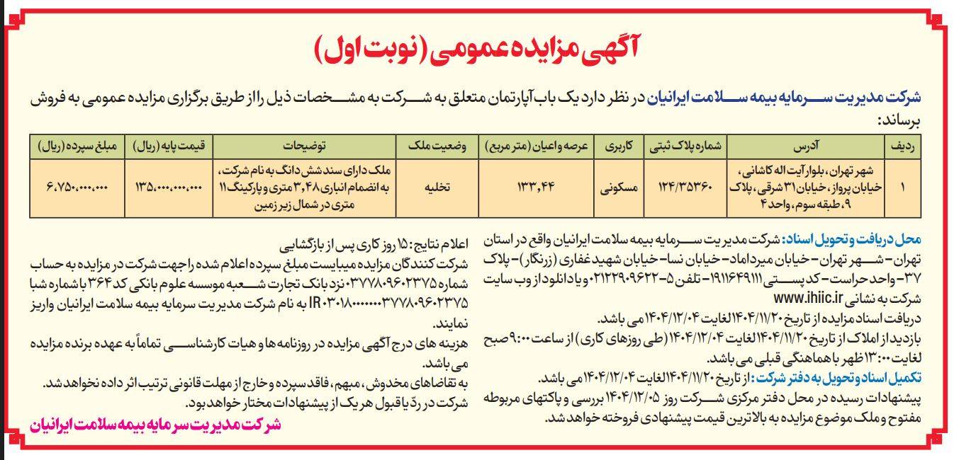 به گزارش روابط عمومی شرکت مدیریت سرمایه بیمه سلامت ایرانیان، بر اساس آگهی مزایده عمومی منتشر شده در روزنامه اطلاعات مورخ دوشنبه ۲۰ بهمن ماه ۱۴۰۴، شرکت مدیریت سرمایه بیمه سلامت ایرانیان در نظر دارد نسبت به فروش یک باب آپارتمان متعلق به شرکت اقدام کند.
